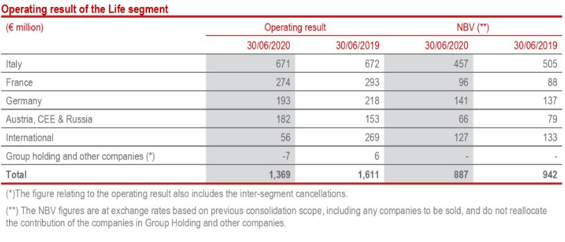 The operating result stood at € 1,369 million (€ 1,611 million 1H19), reflecting the slowdown of the net investment result due to the negative impact of the markets, and, in particular, to the resulting acceleration of provisions for guarantees for policyholders in Switzerland, also due to the effects of Covid-19. The technical margin net of insurance operating expenses improved mainly thanks to the performance witnessed in Germany.