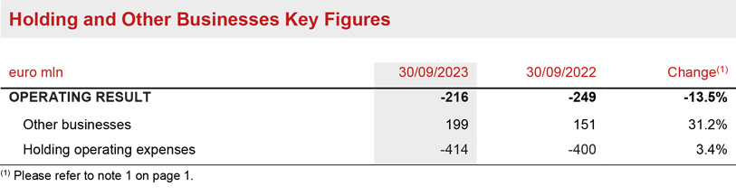 The operating result of the Holding and other businesses segment improved to € -216 million (€ -249 million 9M2022). The contribution from Other businesses was positive, mainly due to the improvement recorded in France, primarily thanks to higher intragroup dividends, and Planvital. Holding operating expenses increased by 3.4%, mainly driven by costs related to personnel and projects for the implementation of new strategic initiatives.