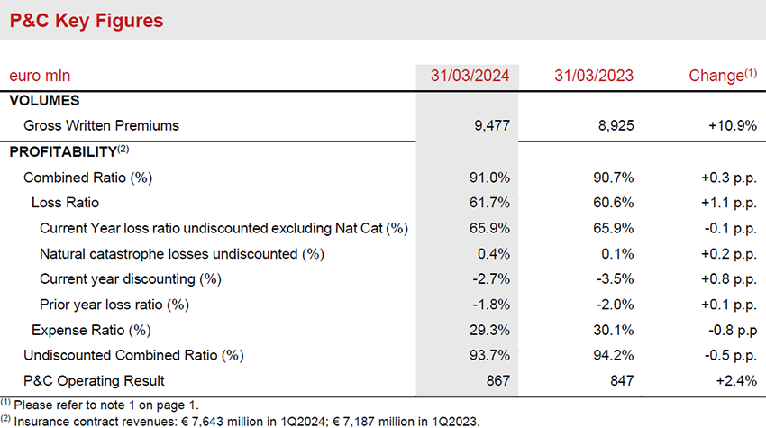 The operating result of the P&C segment increased to € 867 million (+2.4%) also benefitting from Liberty Seguros, which was consolidated starting from February 2024. The Combined Ratio was 91.0% (90.7% 1Q2023) reflecting a smaller benefit from discounting. The undiscounted Combined Ratio improved to 93.7% (94.2% at 1Q2023).