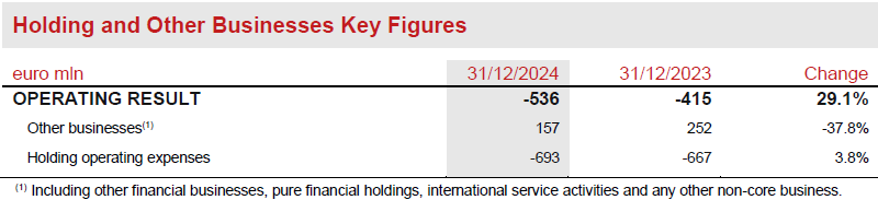 The operating result of Other businesses amounted to € 157 million (€ 252 million FY2023), impacted by lower intragroup dividends. Operating expenses grew by 3.8% mainly reflecting the higher cost of share-based payments and higher development costs related to internal projects.